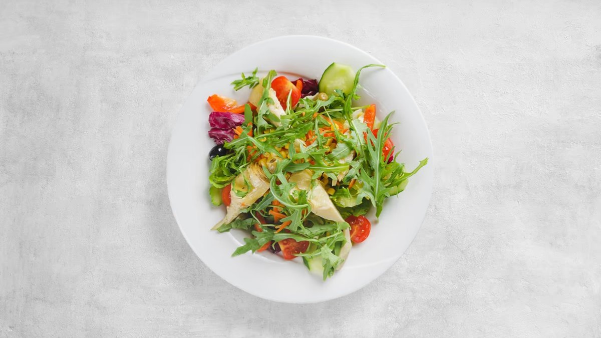 Vitost, oliver, lök, ananas, tomat, feferoni, isbergssallad, paprika, oliver, lök och valfri sås.