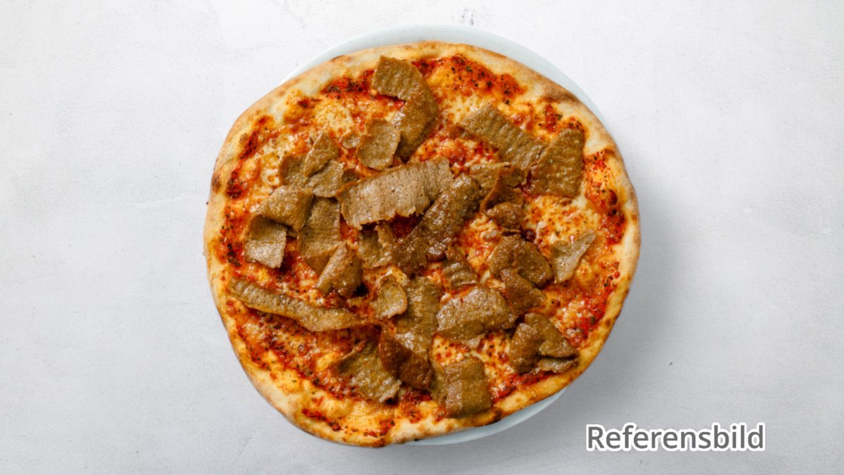 En pizza med kebabkött, grönsaker och sås på en krispig botten.