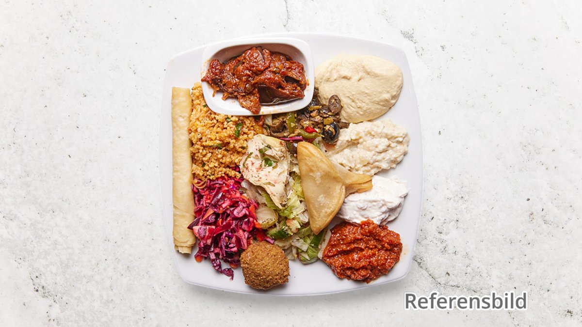 Serveras med nötkött, sallad, 5 olika meze, tabbouleh och pommes.