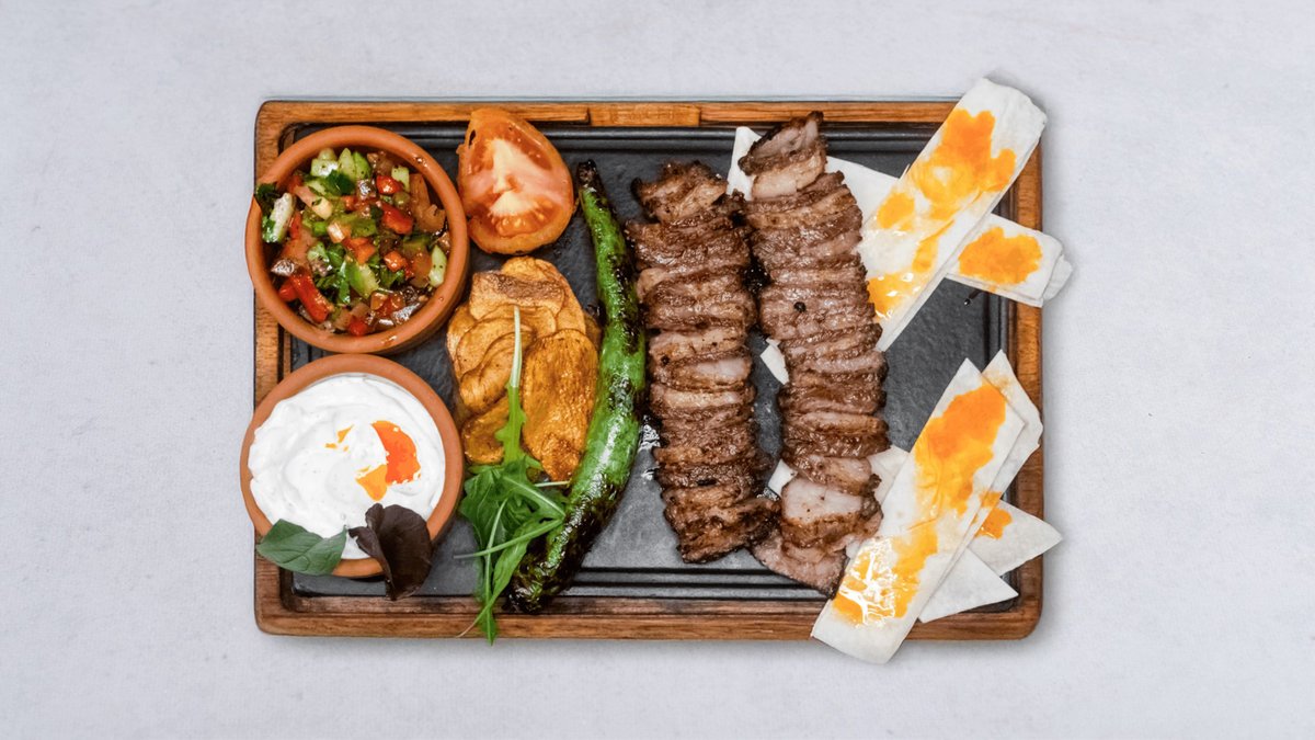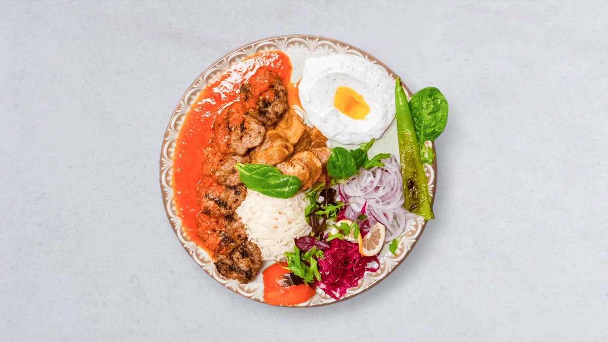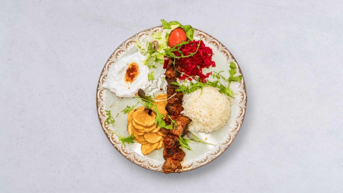 Grillad lammfärsspett eller kycklingfärsspett i tunnbröd med paprika, tomatsås, brynt smör, ost, ris, råstekt potatis, grillad tomat, paprika och vitlöksyoghurt.