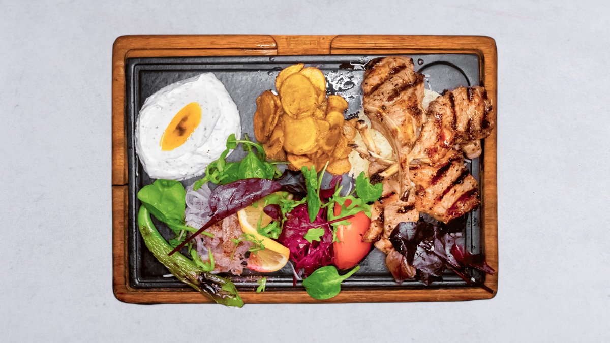 Marinerad lamminnerfile, lammkotlett och entrecoté. Serveras med ris, crispy potatoes, grillad tomat, paprika, tunnbröd och vitlöksyoghurt.