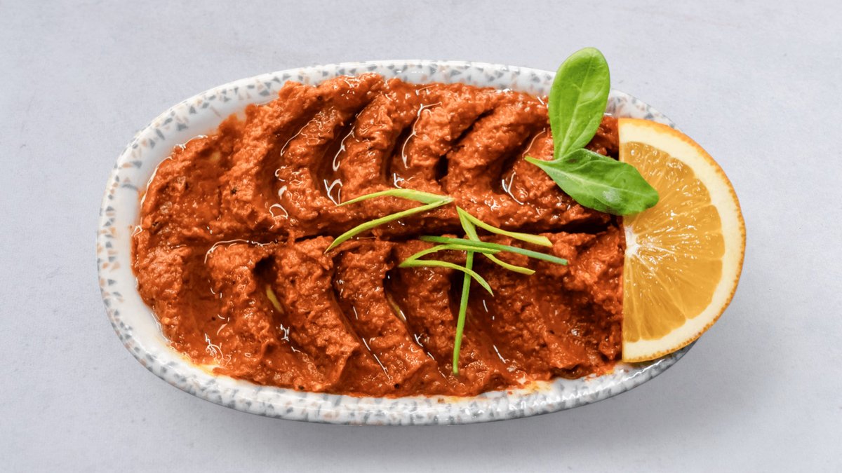 Serveras med hackade tomater, lök, paprika, persilja och granatäpplesirap.