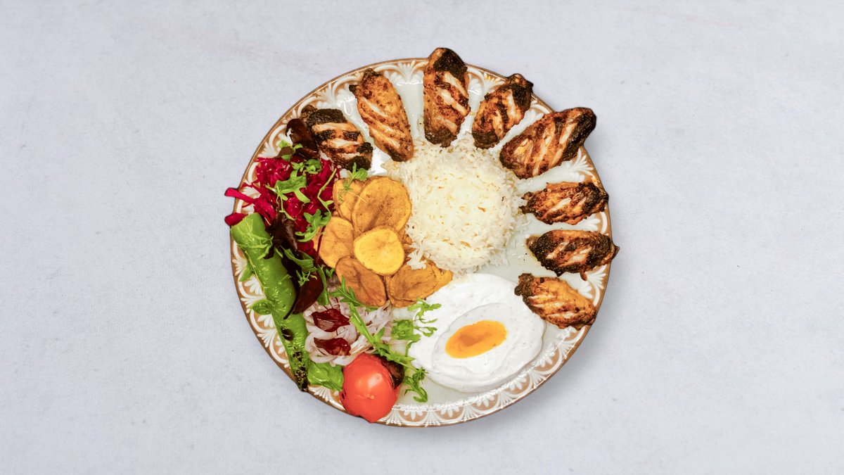 Grillad kycklingfilébitar, kycklingkotletter, kycklingvingar och kycklingfärsspett. Serveras med ris, råstekt potatis, grillad tomat, paprika och vitlöksyoghurt.