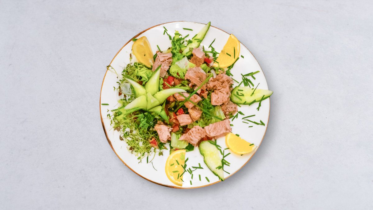 Tonfisk sallad med tomat, gurka, rödlök, paprika, citron och valfri sås. Serveras med bulgur, persilja och tomat.