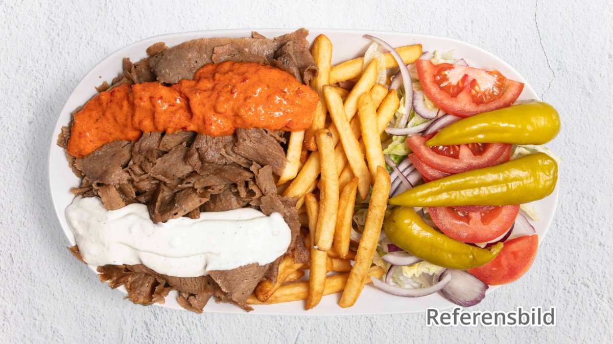 Serveras med nötkött, sallad, pommes och kebabsås.