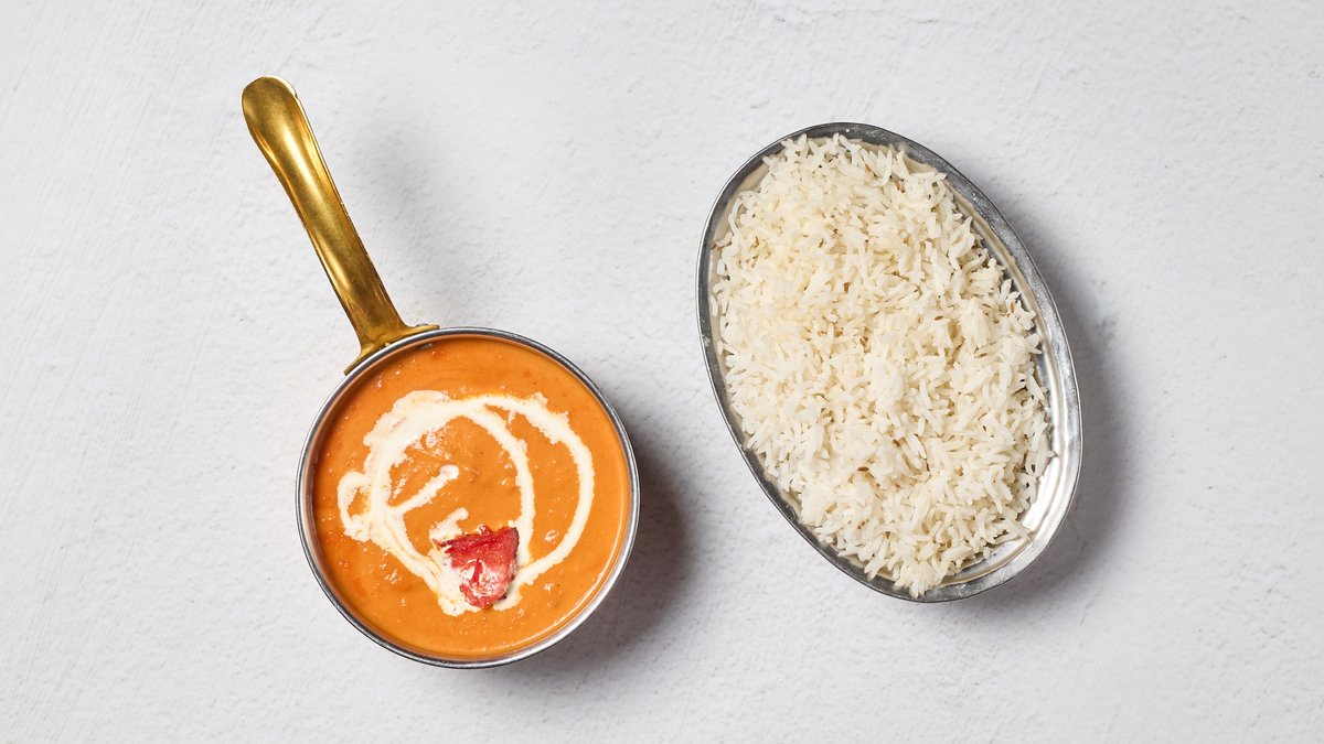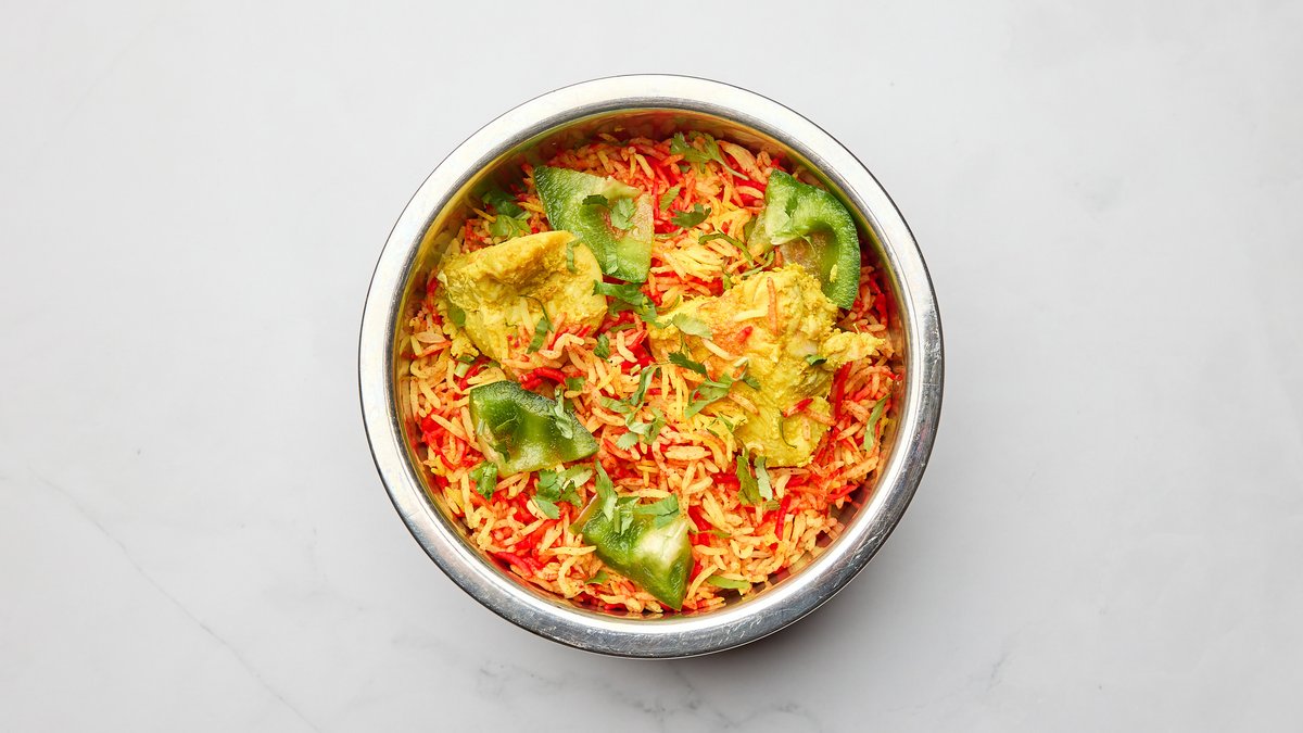 Lamm i smörstekta kryddor och basamtiris med lök, paprika och tomatsås med smak av kardemumma, rosvatten och russin. Serveras med raita.