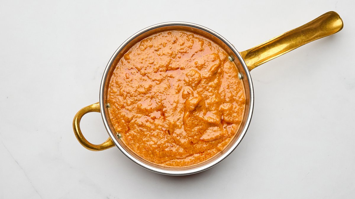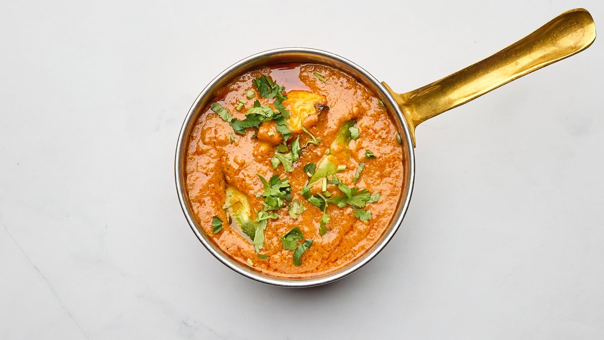 Hemgjord färskost tillagad med smör, tomat, nötter och koriander i tomat-och löksås.
