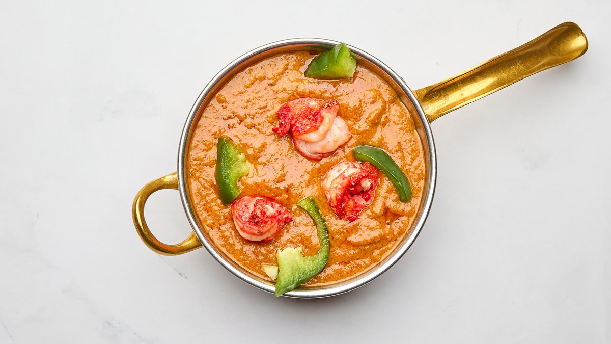 Tigerräkor i tomatsås, tillagade med ingefära, kummin, koriander och citron.