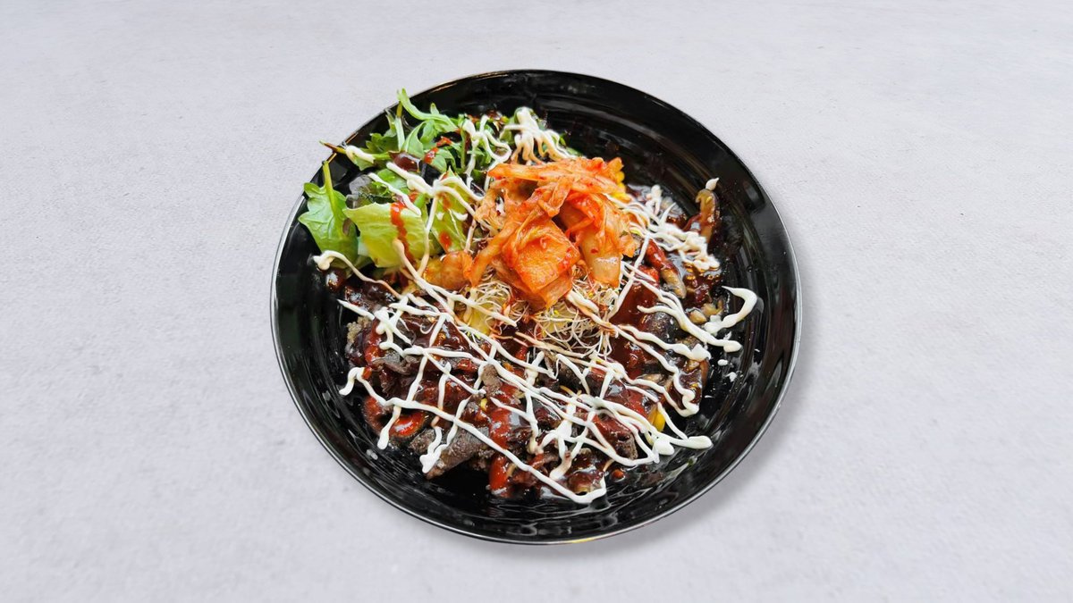 Vitt ris, koreansk marinerad nötkött, ägg, majs, edamame, gurka, morot, svamp, kimchi, sallad och böngroddar.