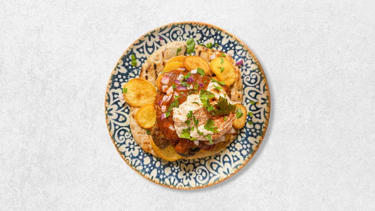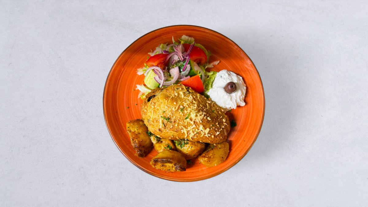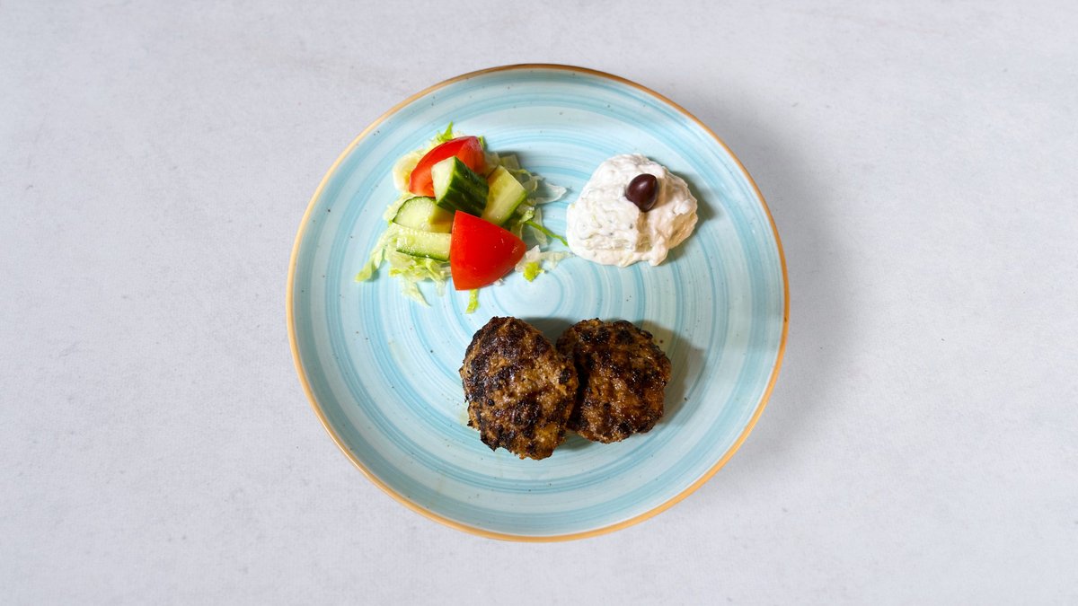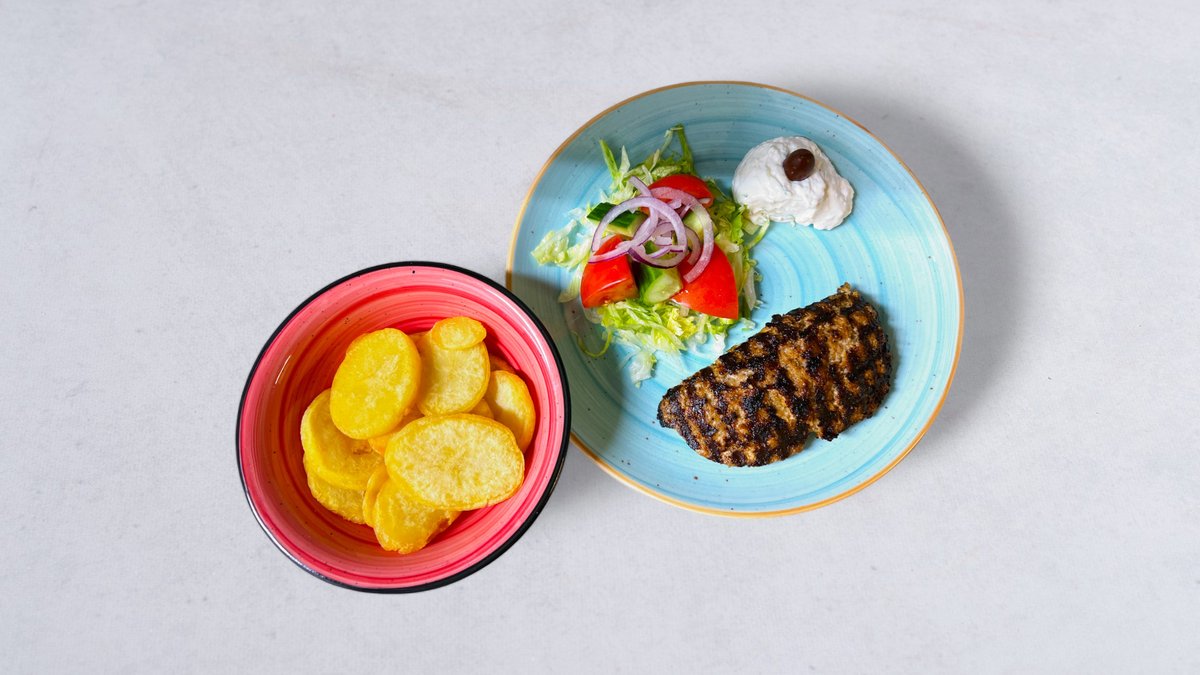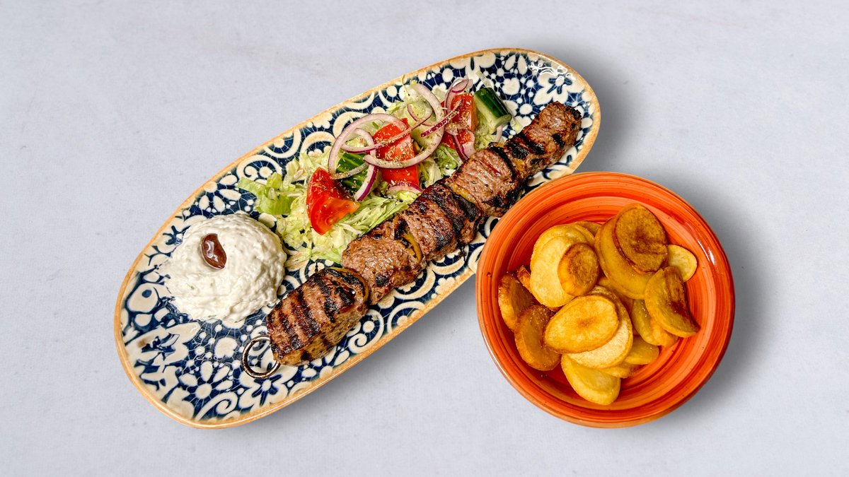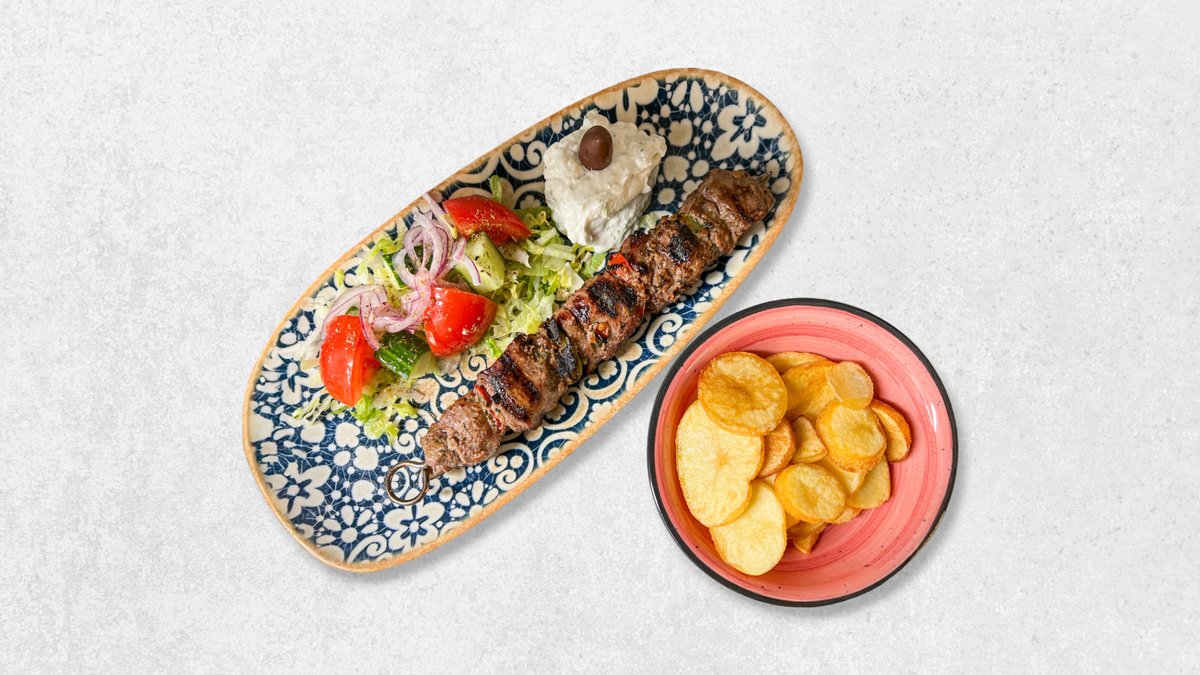 Traditionell kebab gjord på lamm-och nötfärs, kryddad tomatsås, yoghurt och pitabröd. Serveras med friterad potatis, tzatziki samt liten sallad.