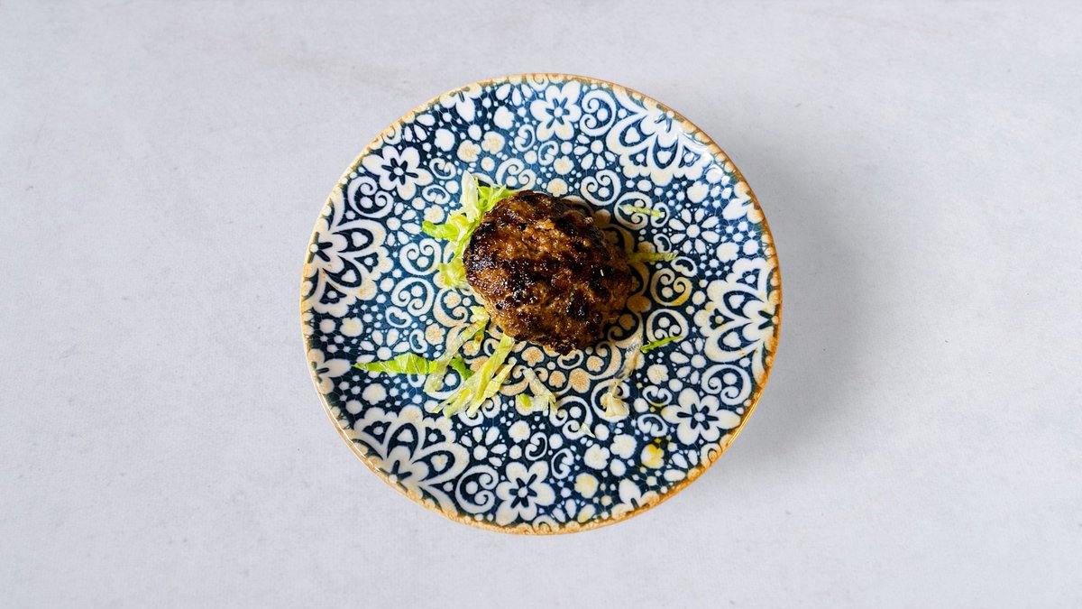 Kalvfärsbiff fylld med fårost, soltorkade tomater och persilja. Serveras med friterad potatis, tzatziki samt liten sallad.