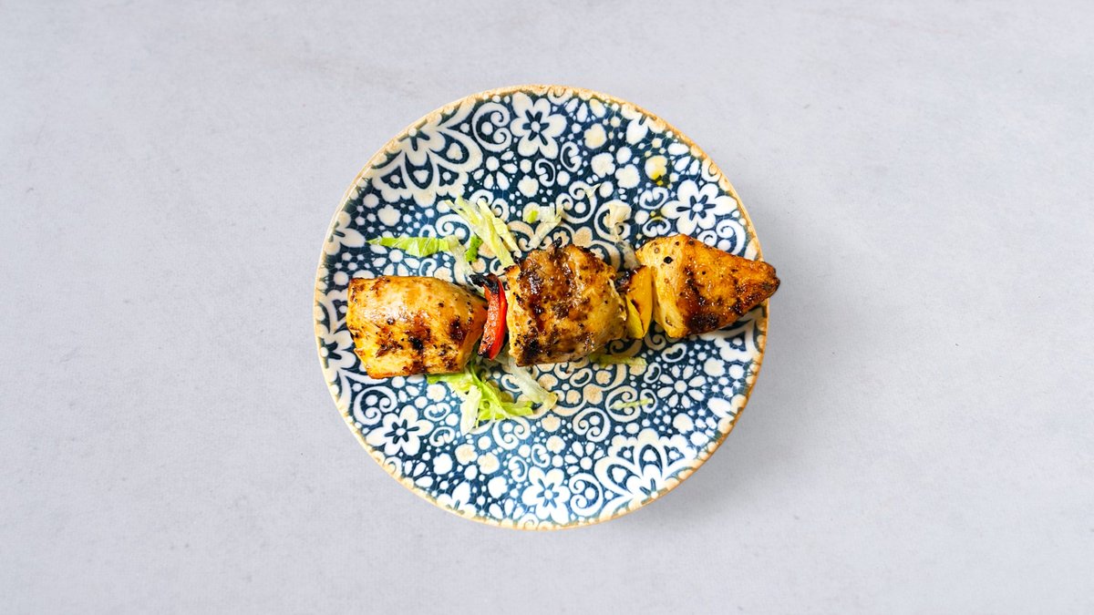 Marinerat grillat kycklingspett. Serveras med potatis, tomat och gurka.