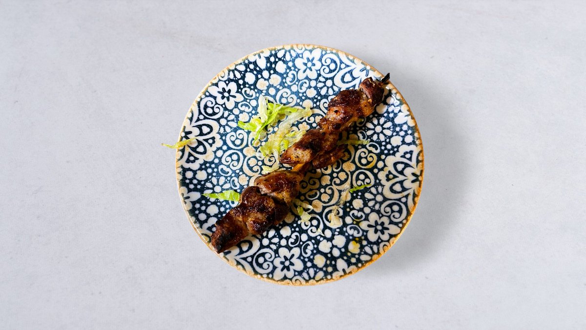 Marinerat fläskkött på spett. Serveras med friterad potatis, tzatziki samt liten sallad.