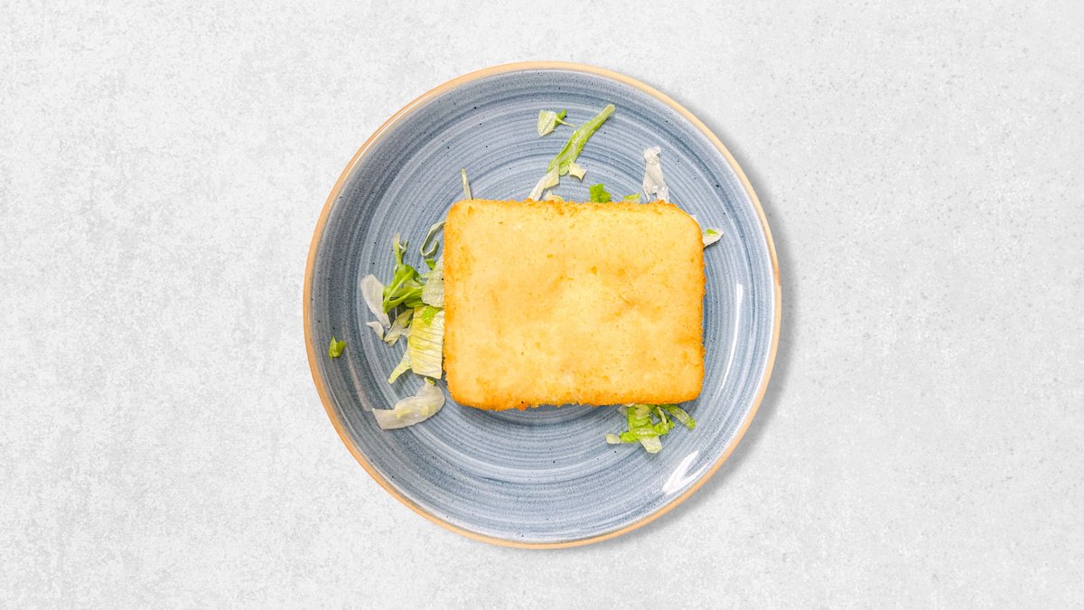 Aubergine, potatis, nötfärs, ostbechamel. Serveras med tomat och gurka.