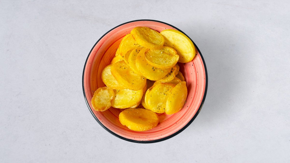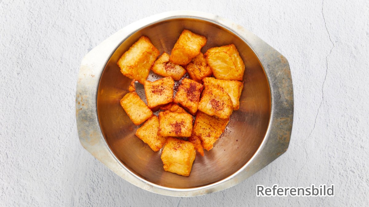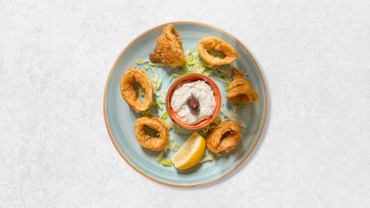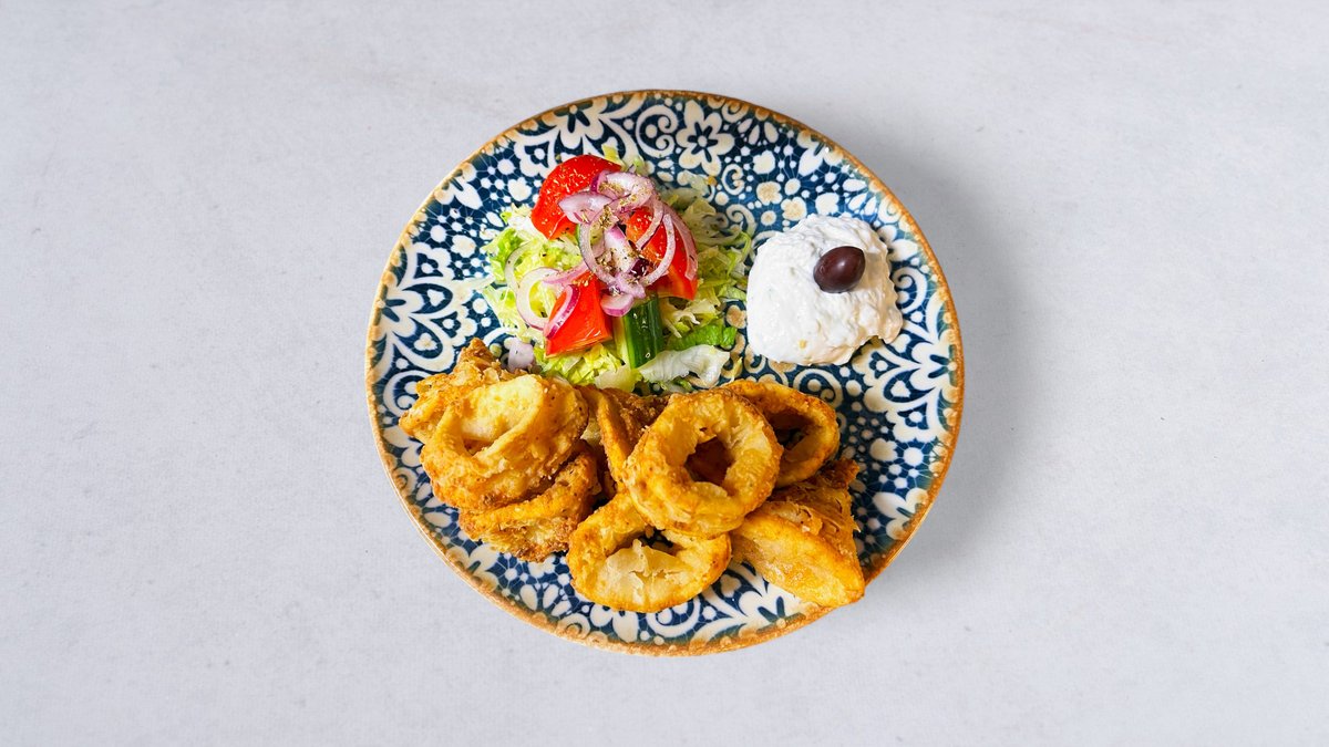 Friterade kryddade kalamares. Serveras med potatis och sallad.