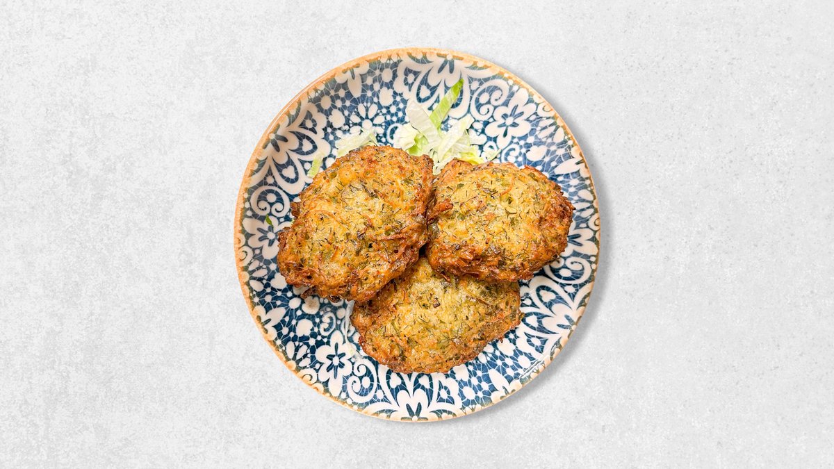 Stekta squashplättar smaksatta med vitlök. Serveras med potatis, sallad och tzatziki.