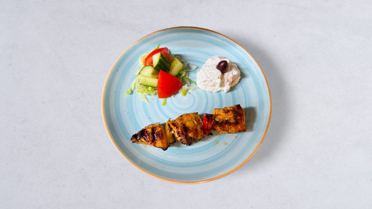 Marinerad kyckling på spett. Serveras med friterad potatis, tzatziki samt liten sallad.