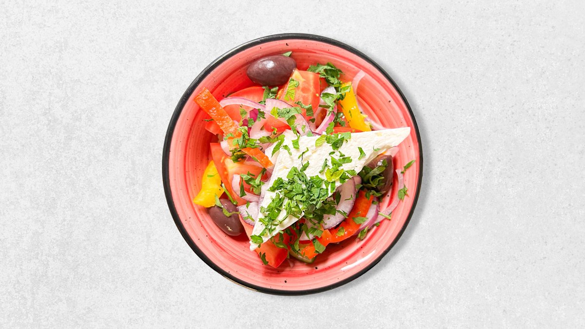 Grekisk bondsallad med tomat, rödlök, gurka, oliver, paprika och fårost.