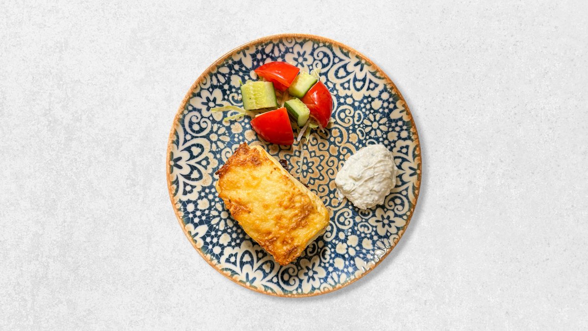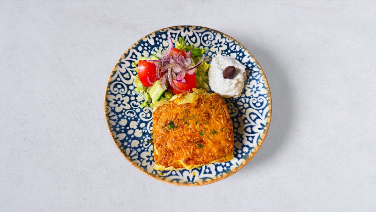 Aubergine, potatis, nötfärs och ostbechamel. Serveras med sallad och tzatziki.