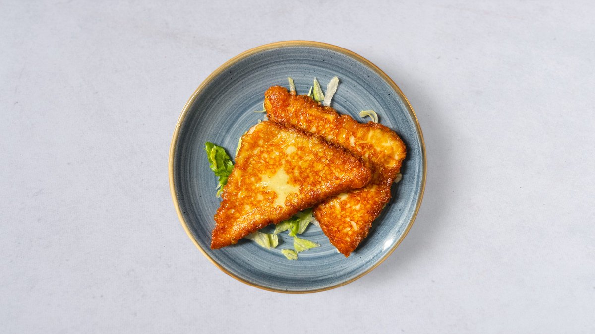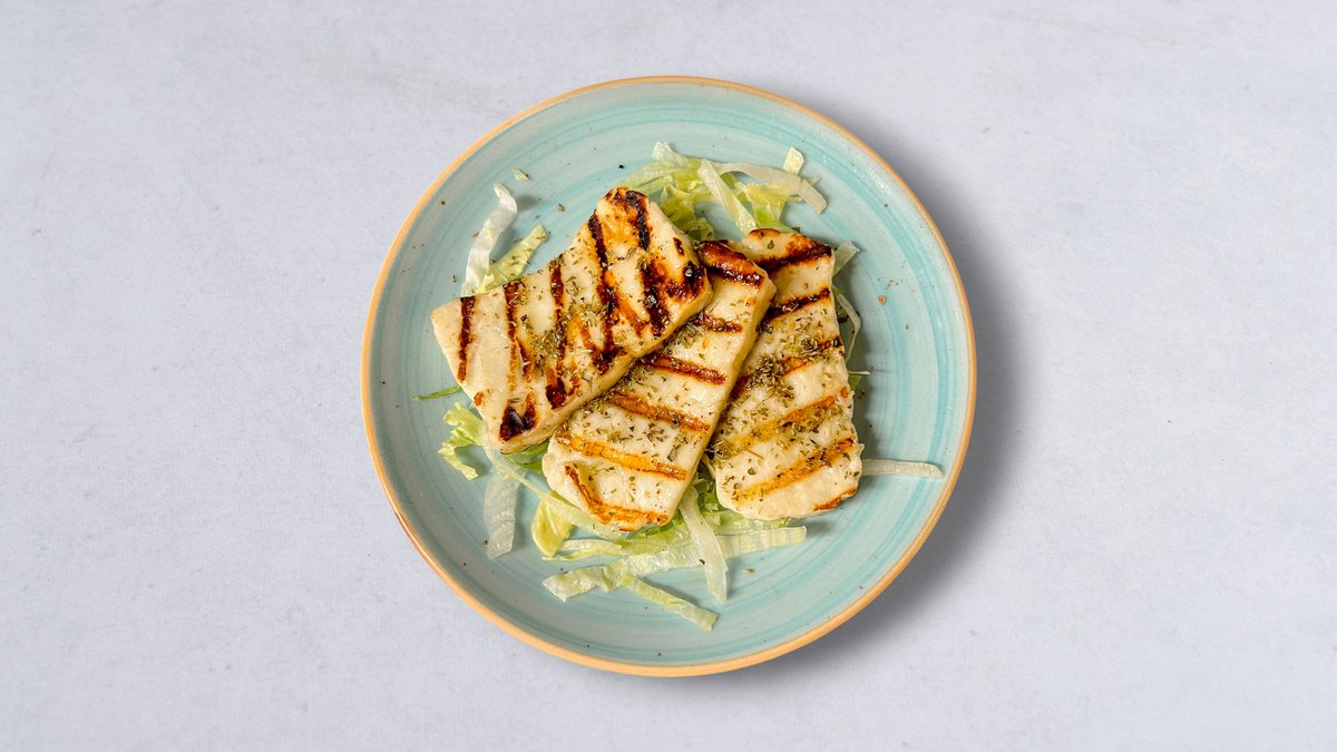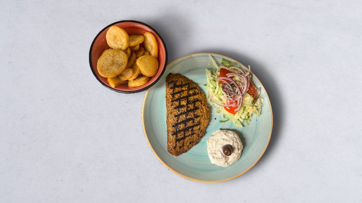 Grillad soyafärsbiff fylld med fetaost och soltorkade tomater, serveras med sallad, friterad potatis och tzatziki.