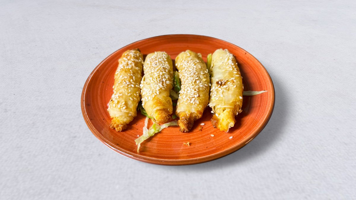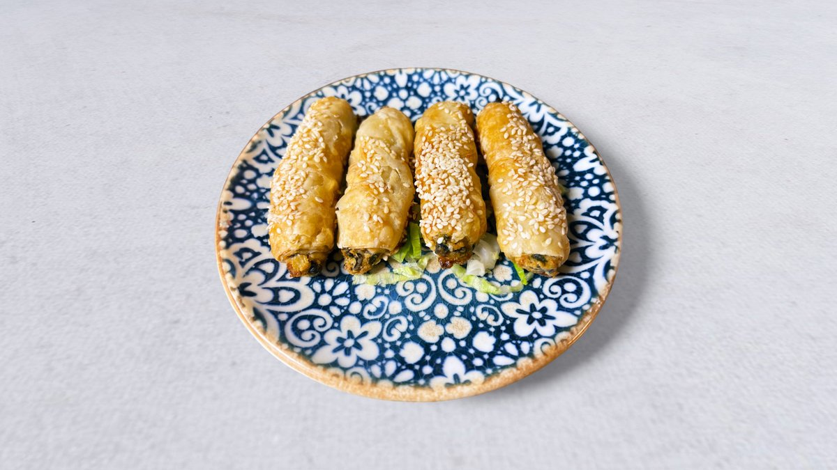 Hemmagjorda filodegspiroger fyllda med spenat och fårost. Serveras med sallad och tzatziki.