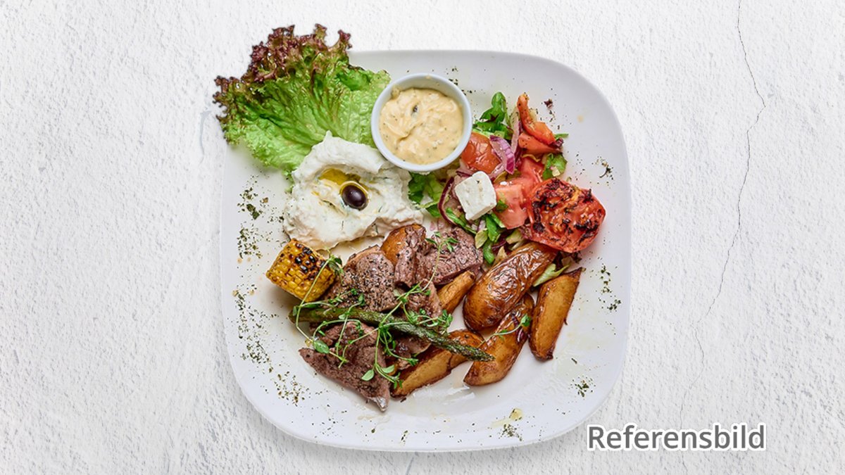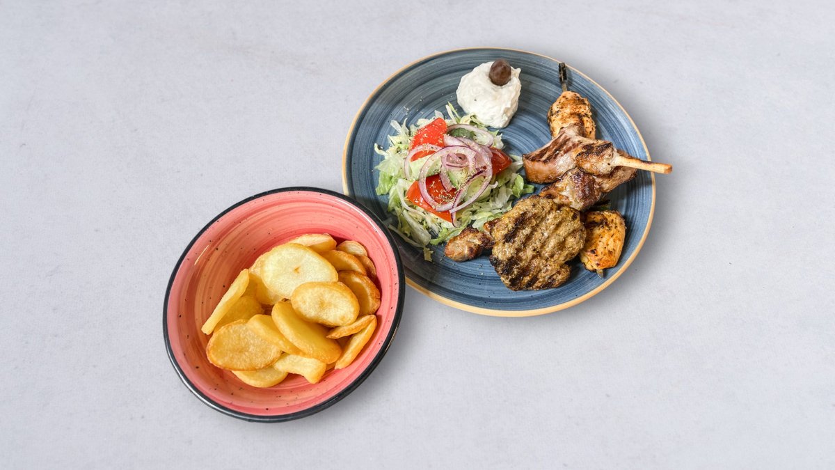 Blandat från grillen. Grillspett av fläsk samt kyckling, lammkotlett och kalvfärsbiff. Serveras med friterad potatis, tzatziki samt liten sallad.