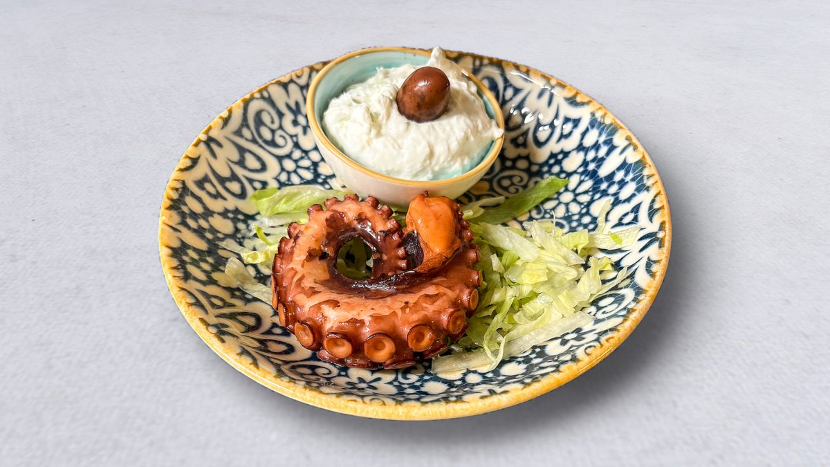 Grillad bläckfisk. Serveras med tzatziki, olja och citron.