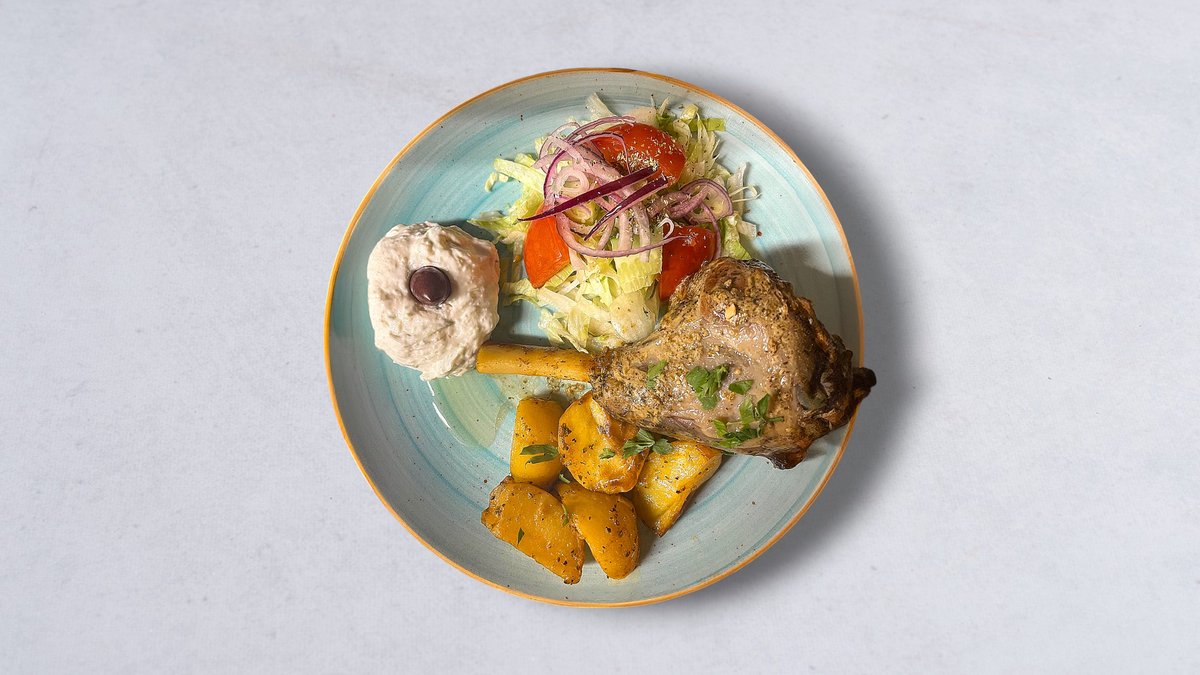 Ugnsbakat lammlägg. Serveras med ugnsbakad potatis, sallad och tzatziki.