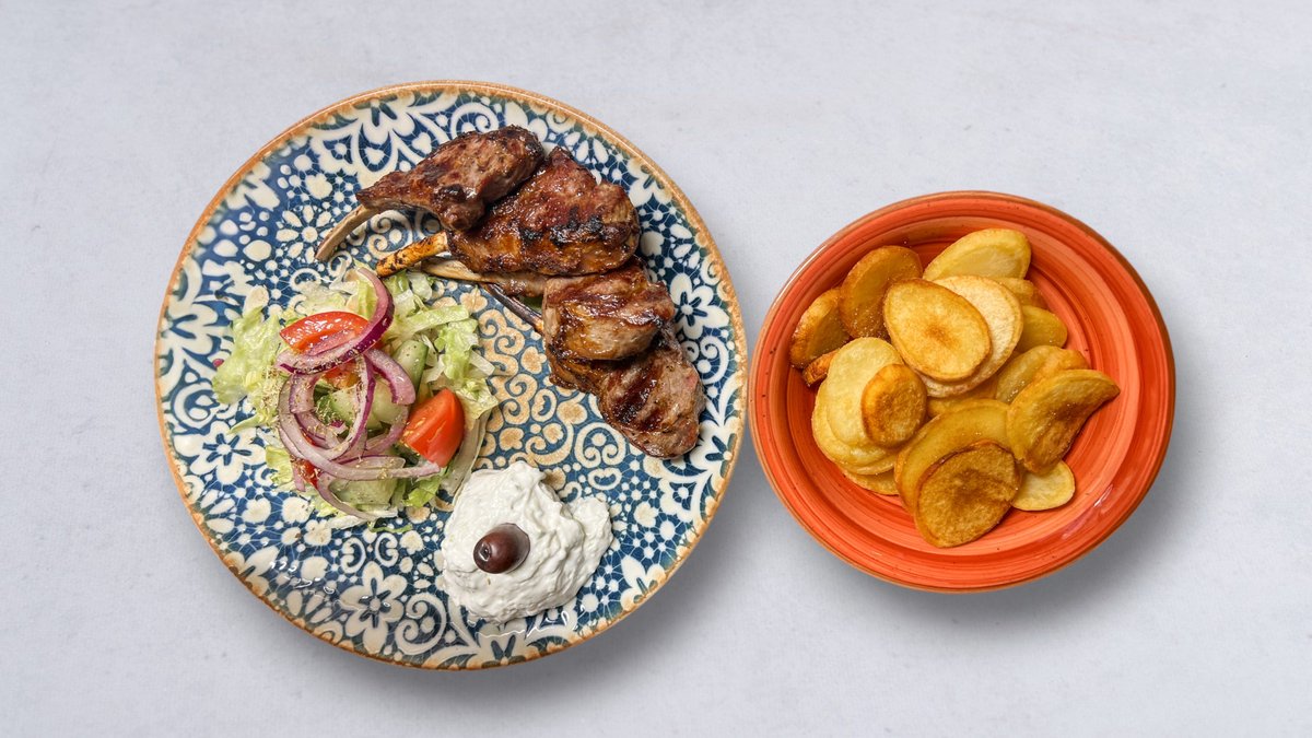 Marinerade lammracks. Serveras med friterad potatis, tzatziki samt liten sallad.