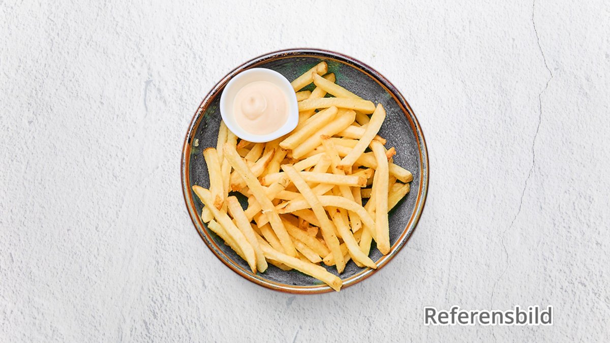 Burgare med tomat, krispsallad, picklad gurka, picklad rödlök, dressing och pommes.