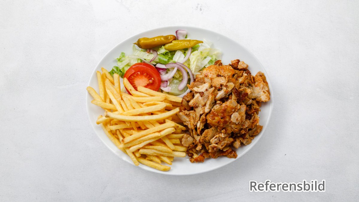 Serveras med isbergssallad, tomat, gurka, rödlök, peperoni och valfri sås, med ris eller pommes.