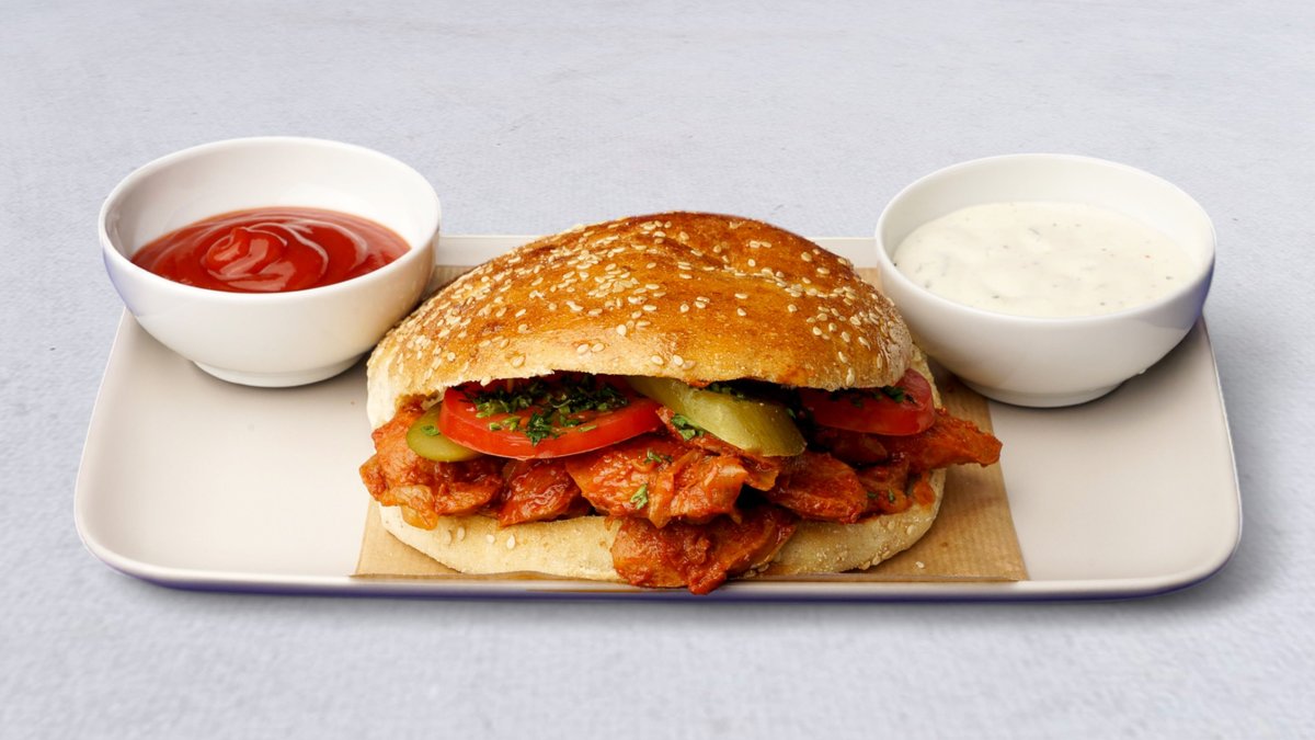 Serveras med ugnsgrillad kyckling, valfritt tillbehör, rödlök, rödkål, tomat, saltgurka, pepperoni och sås.