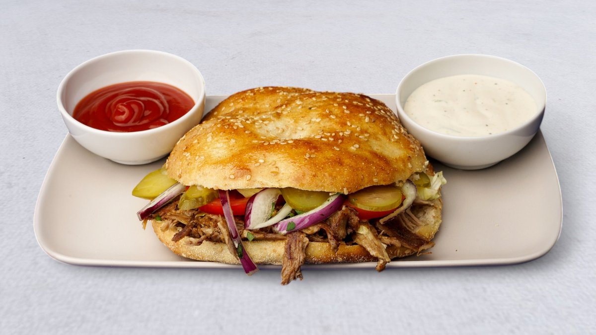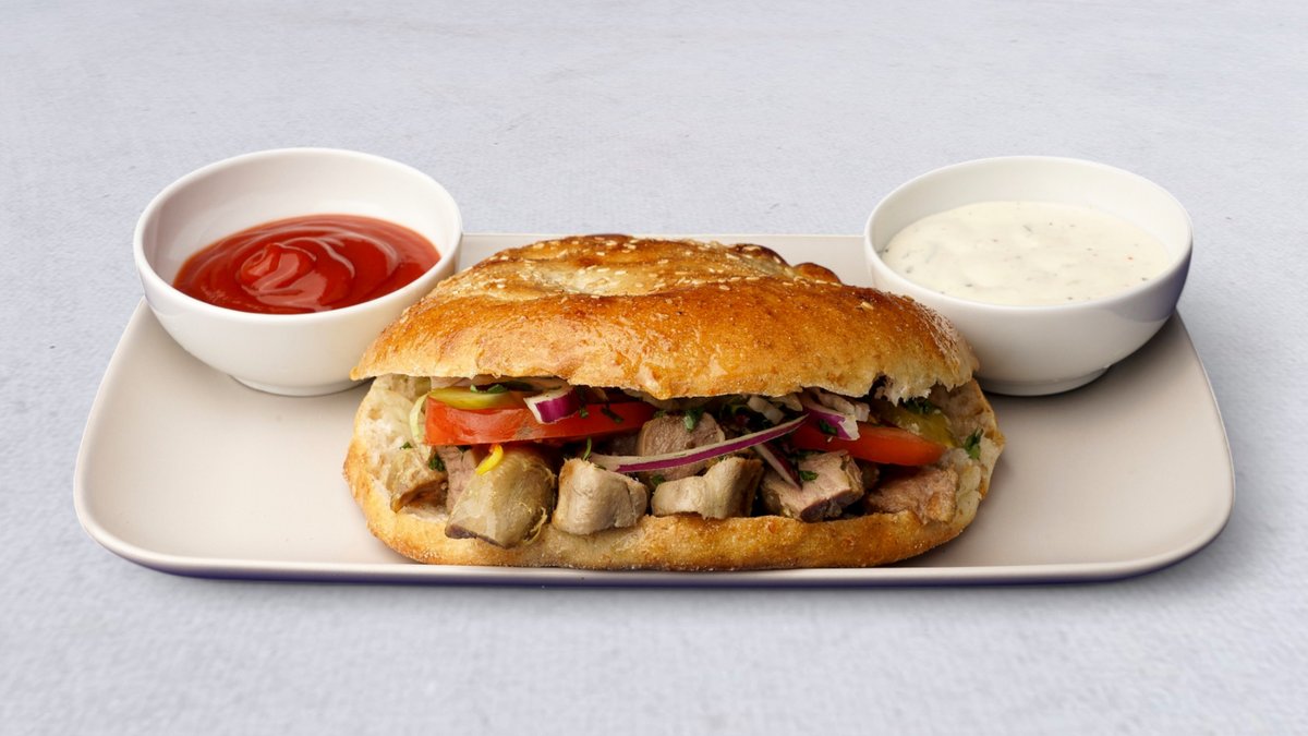 Serveras med stekt lammtunga, hembakat bröd, tomat, saltgurka, lök, pepperoni och sås.