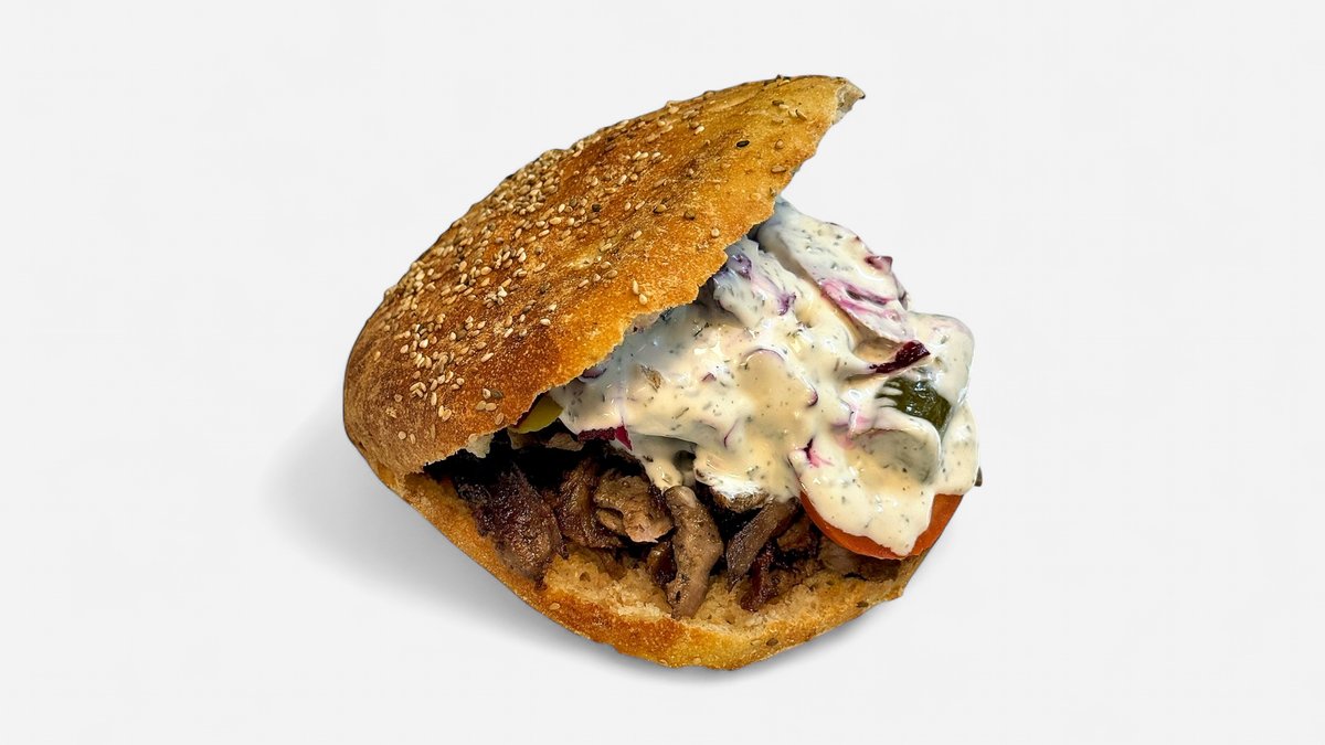 Serveras med ugnsgrillad lamm, sås, rödlök, rödkål, tomat, saltgurka och pepperoni.