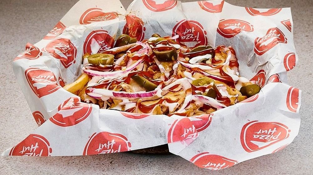 Pommes frites, kyckling, BBQ sås, jalapeños, rödlök och vitlökssås.