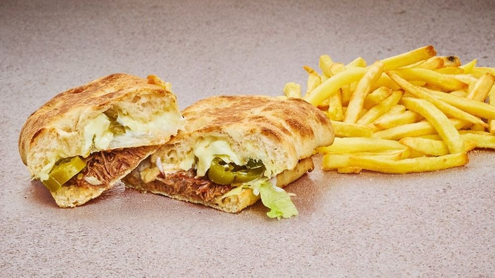 Ciabattabröd, mozzarella, pulled beef, jalapeños, sallad, vitlökssås. Serveras med pommes.