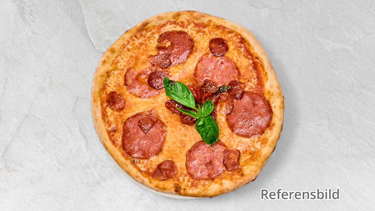 Tomatsås, ost, lök, salami och pepperonikorv.