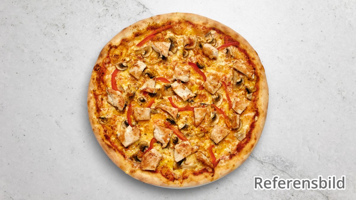 Tomatsås, ost, kyckling, champinjoner, salami, lök och tomater.