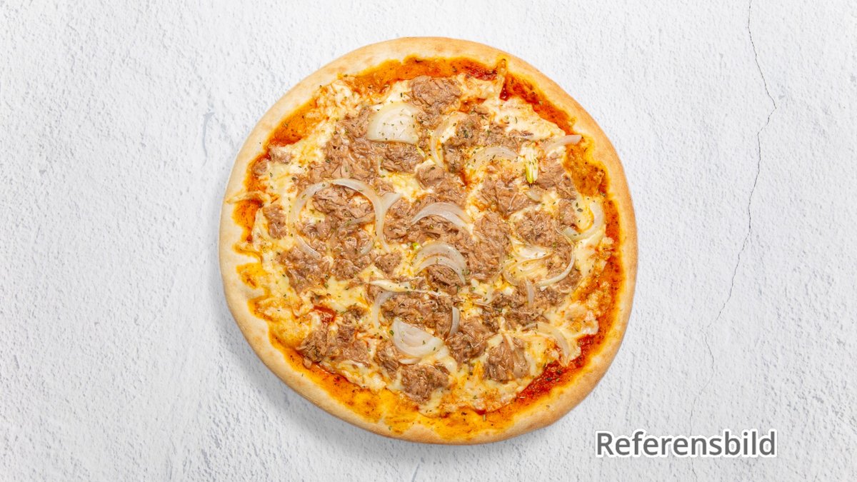 Tomatsås, ost, skinka och tonfisk.