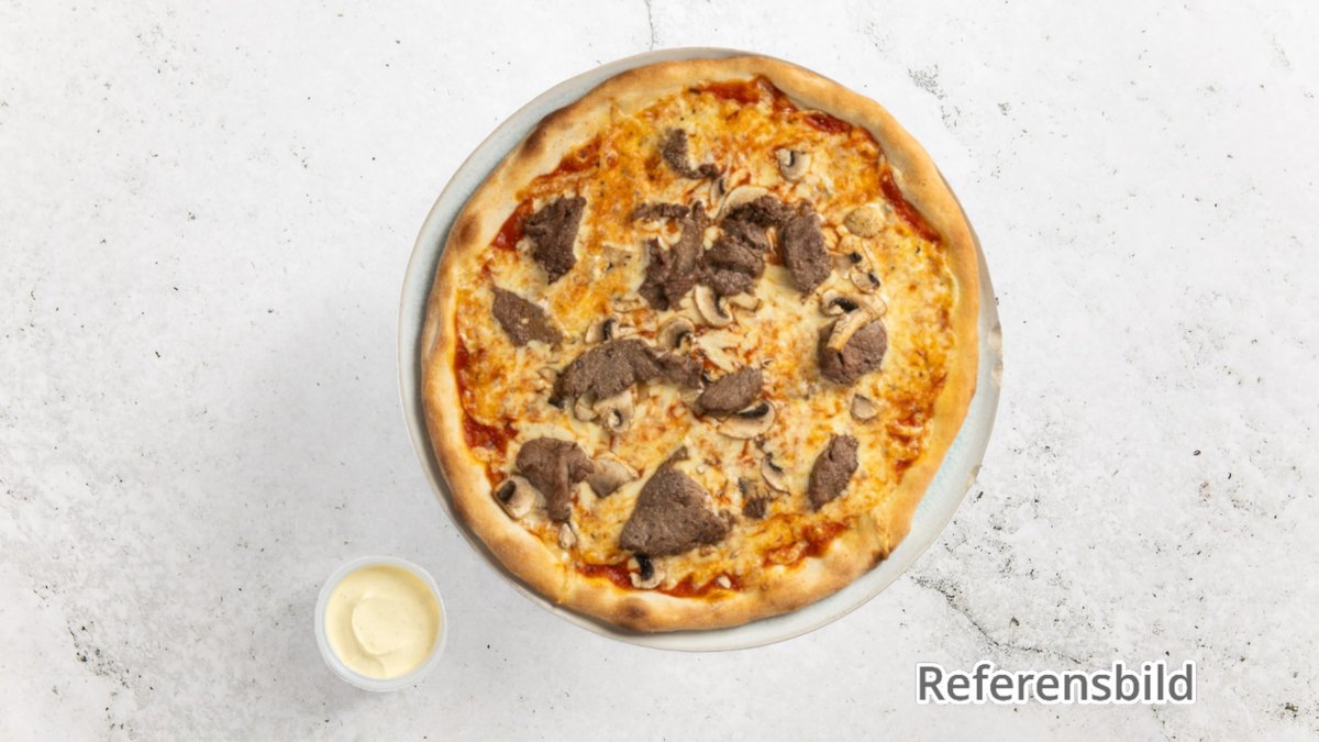 Pizza med oxfilé, kantareller, jalapeño, lök, tomat, champinjoner, paprika och bearnaisesås.