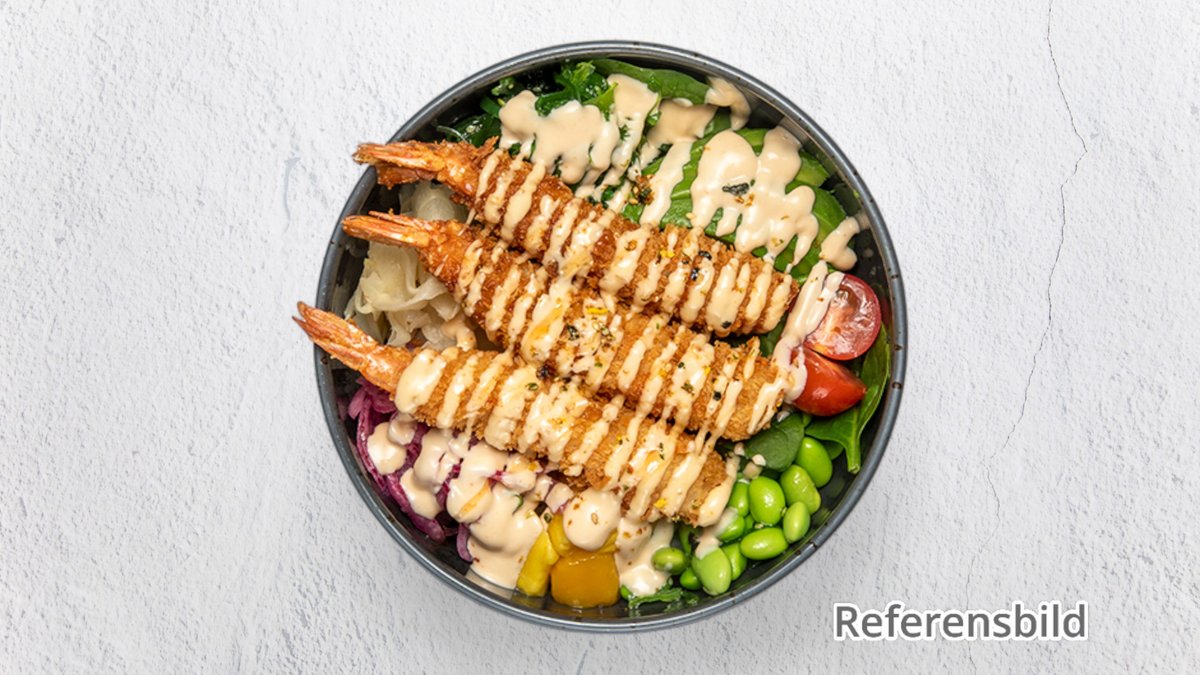 2 st tempura och avokado med sushiris, kålsallad och flera tillbehör. Toppad med chilimajonnäs, wasabi, pokesås och sesam.