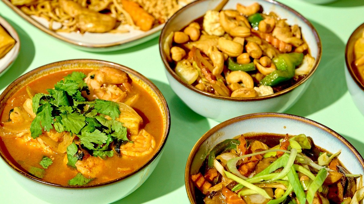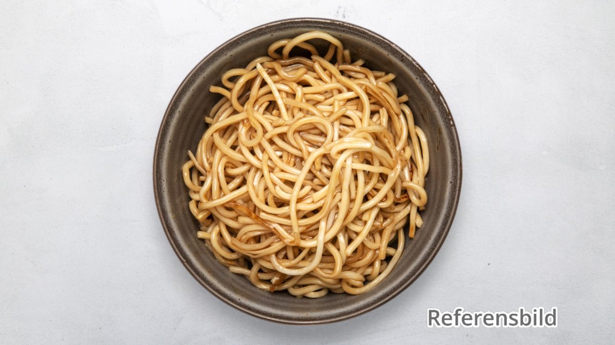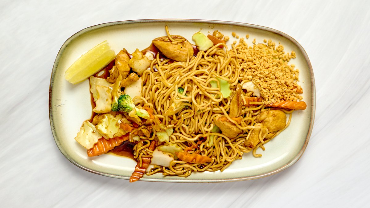 Stark. Serveras med ris nudlar, ägg, vitkål, purjolök, sojasås, ostronsås, jordnötter och citron.
