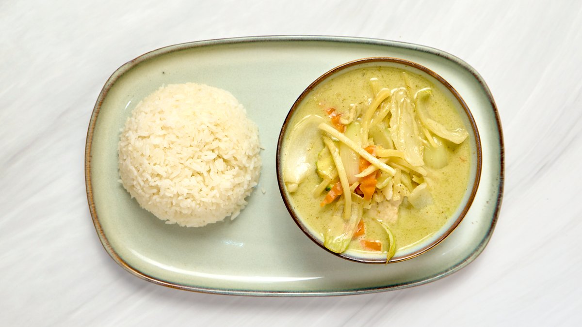 Medelstark. Serveras med grön curry, kokosmjölk, lök, morot, bambuskott och zucchini.