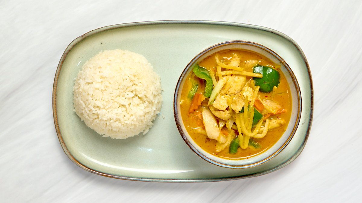 Medelstark. Äggnudlar, rödcurry, kokosmjölk, lök, morot, paprika, bambuskott, broccoli och blomkål.