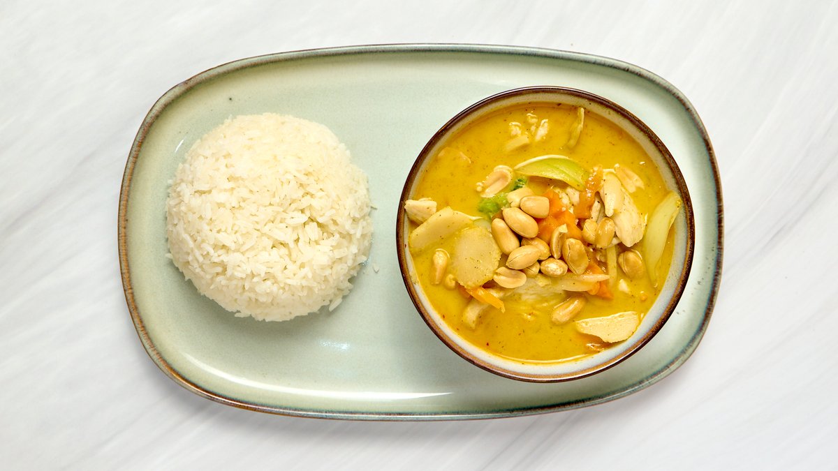 Stark. Serveras med massaman curry, kokosmjölk, lök, morot, paprika, vattenkastanjer och jordnötter.