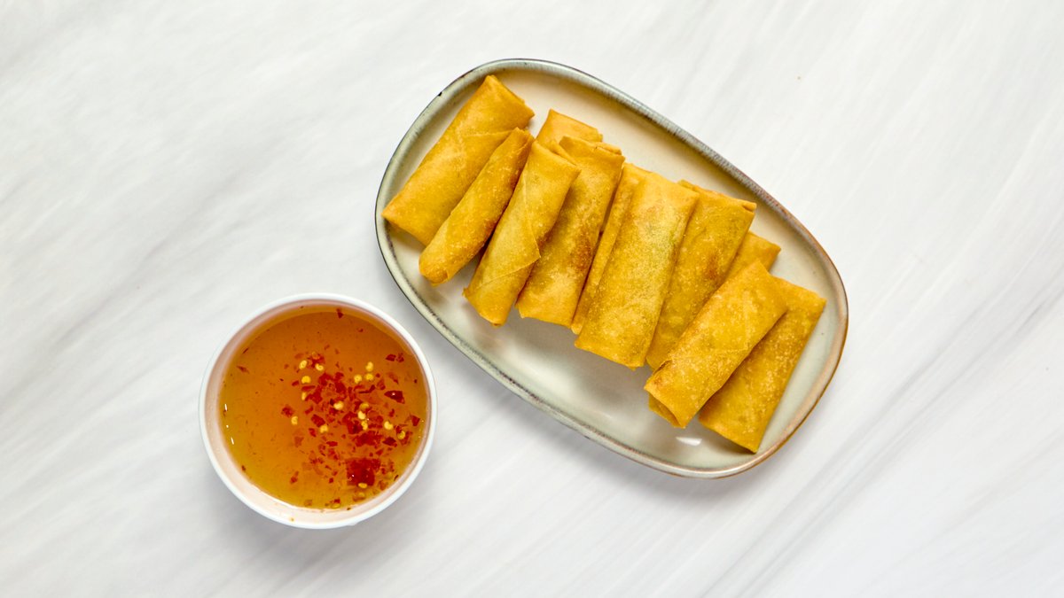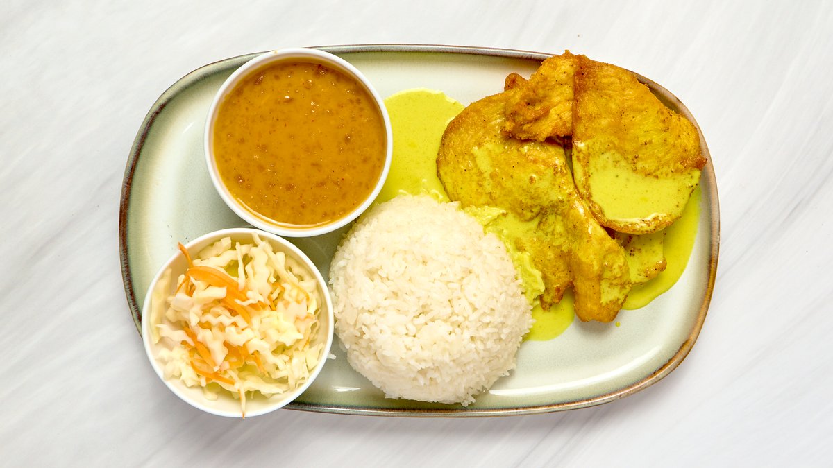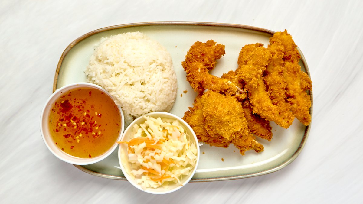 Serveras med 7 st kycklingbitar eller räkor, sallad, sötsur sås och ris.