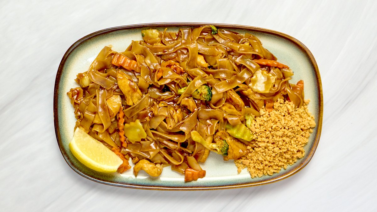 Stark. Serveras med breda risnudlar, vitkål, morot, broccoli, sojasås, ostronsås, jordnötter och citron.