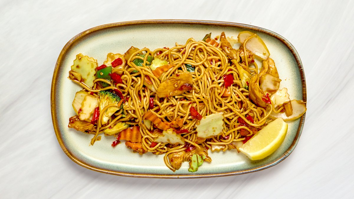 Serveras med lök, paprika, broccoli, morot, sojasås och ostronsås.