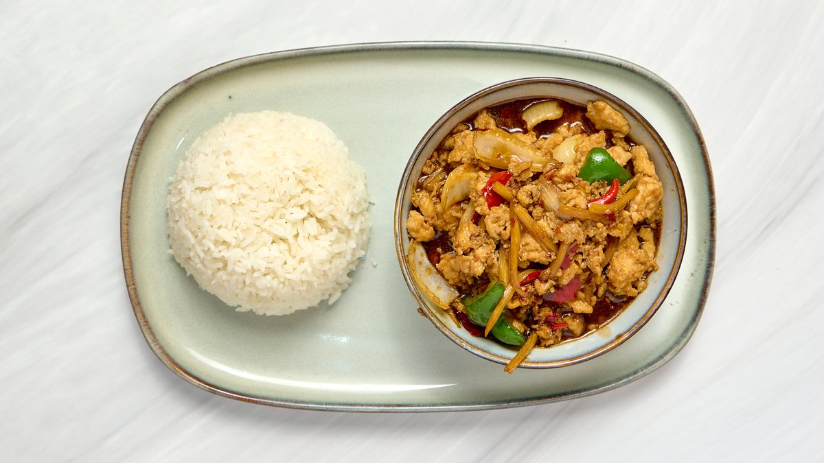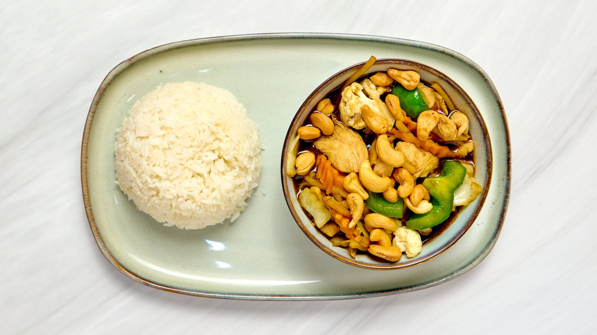 Serveras med cashewnötter, lök, paprika, ananas, sojasås och ostronsås.