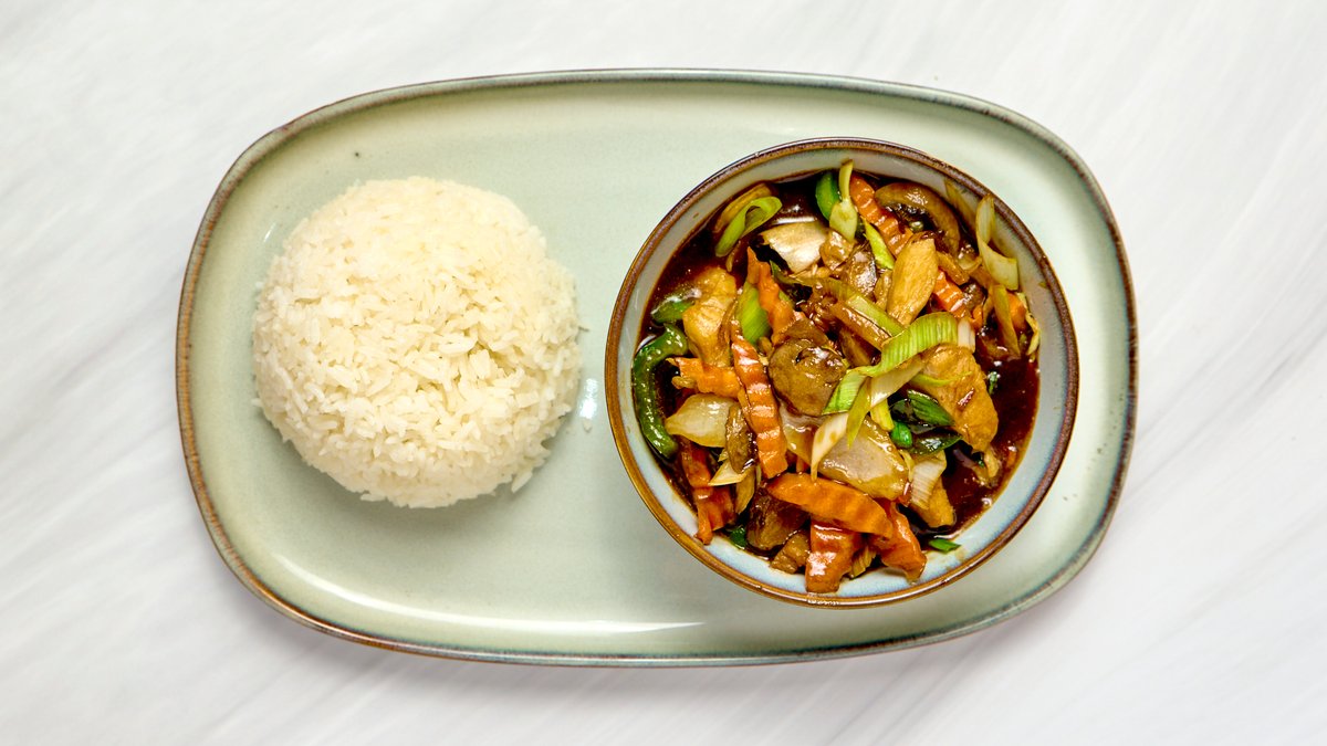 Serveras med ingefära, lök, paprika, morot, champinjoner, purjolök, sojasås och ostronsås.